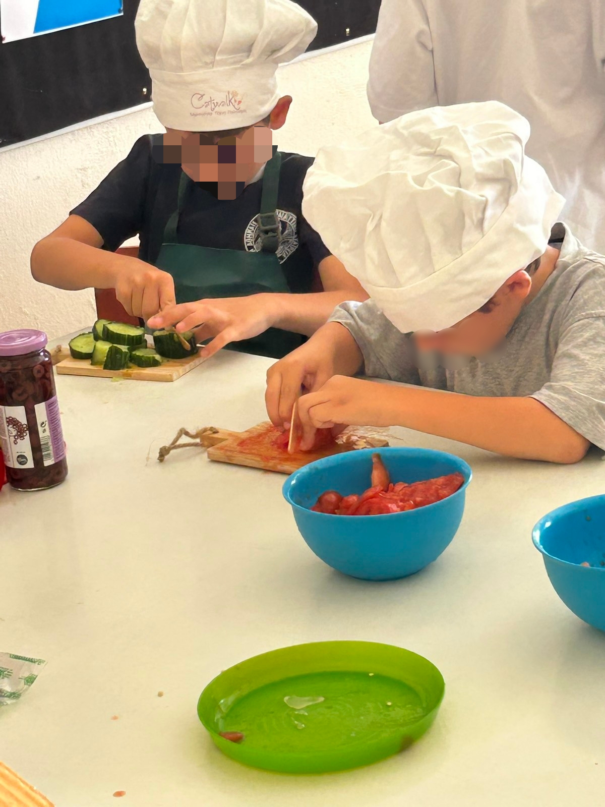 Οι μικροί μας καλεσμένοι φορούν τις στολές και τα σκουφάκια τους, γίνονται μικροί σεφ και μπαίνουν με ενθουσιασμό στην κουζίνα για να φτιάξουν τα πιο λαχταριστά πιάτα παρέα με την ομάδα μας.